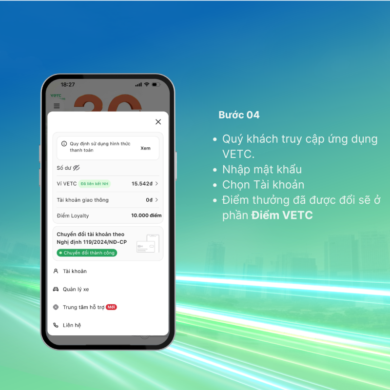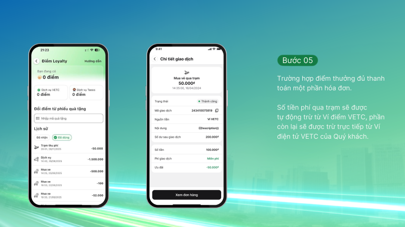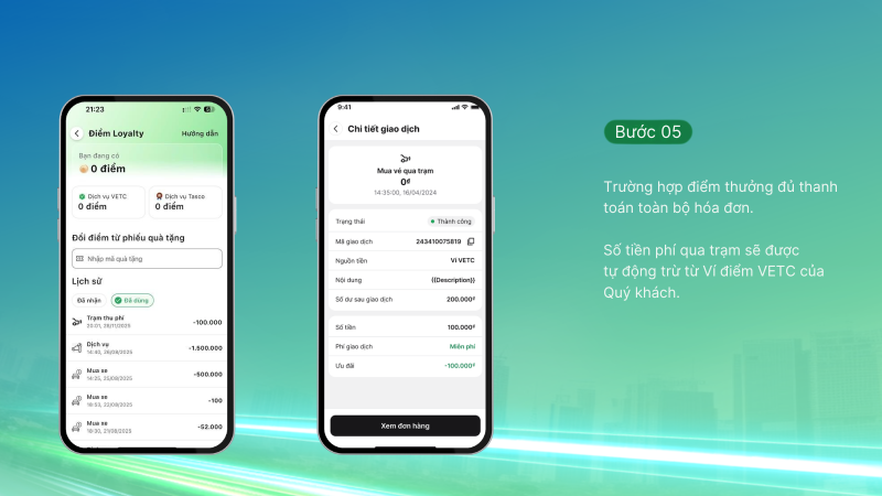Bước 5: Khi Hội viên sử dụng dịch vụ thu phí điện tử không dừng (ETC), số tiền phí qua trạm sẽ được tự động trừ từ Ví điểm VETC của Hội viên.