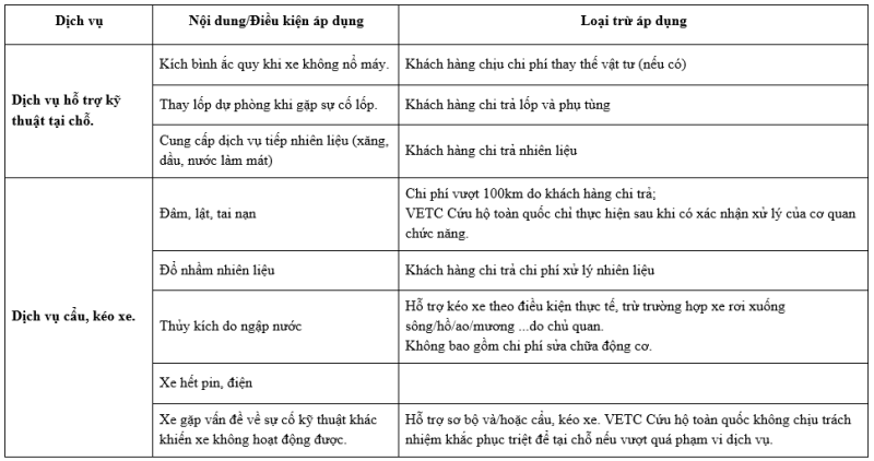 - Mỗi lần cứu hộ được miễn phí trong phạm vi tối đa 100km (tính từ vị trí xe gặp sự cố đến garage/điểm dịch vụ gần nhất).