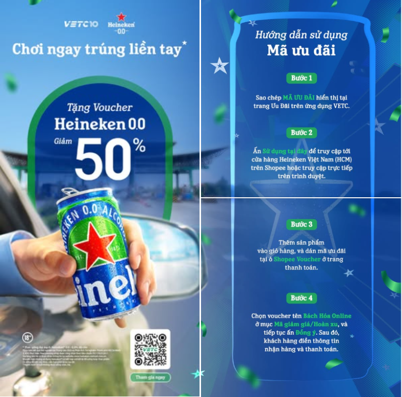 Để tri ân những người lái xe văn minh, Heineken 0.0 dành tặng ưu đãi hấp dẫn thông qua chương trình “Quay ngay trúng lớn” trên ứng dụng VETC. Cơ hội nhận voucher giảm 50% (tối đa 100.000 VNĐ) khi mua lốc 6 lon Heineken 0.0 đang chờ bạn.