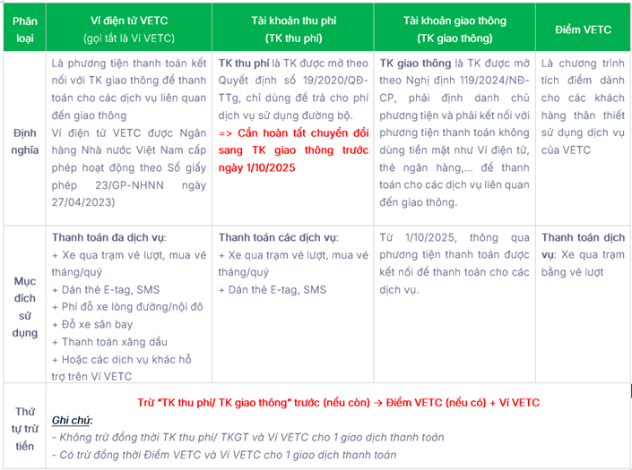 - Các KH đang sử dụng TK thu phí cần chuyển đổi sang TK giao thông trước ngày 1/10/2025 để tránh gián đoạn khi sử dụng dịch vụ.
