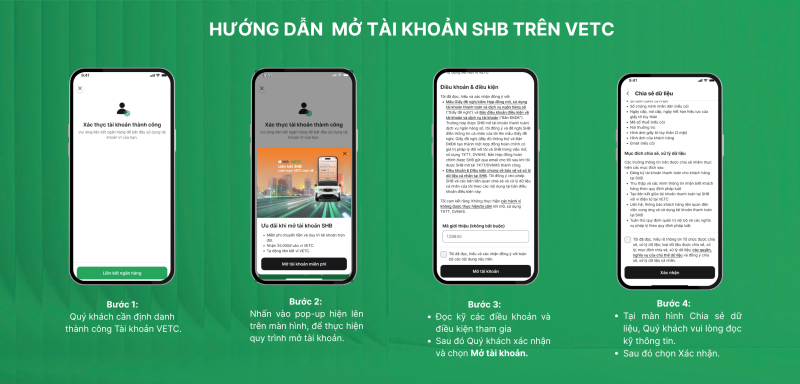 Để sở hữu tài khoản SHB và nhận ưu đãi, Quý khách chỉ cần thực hiện một số thao tác đơn giản ngay trên ứng dụng VETC. Toàn bộ quy trình được số hóa để mang lại sự tiện lợi, nhanh chóng và an toàn tối đa