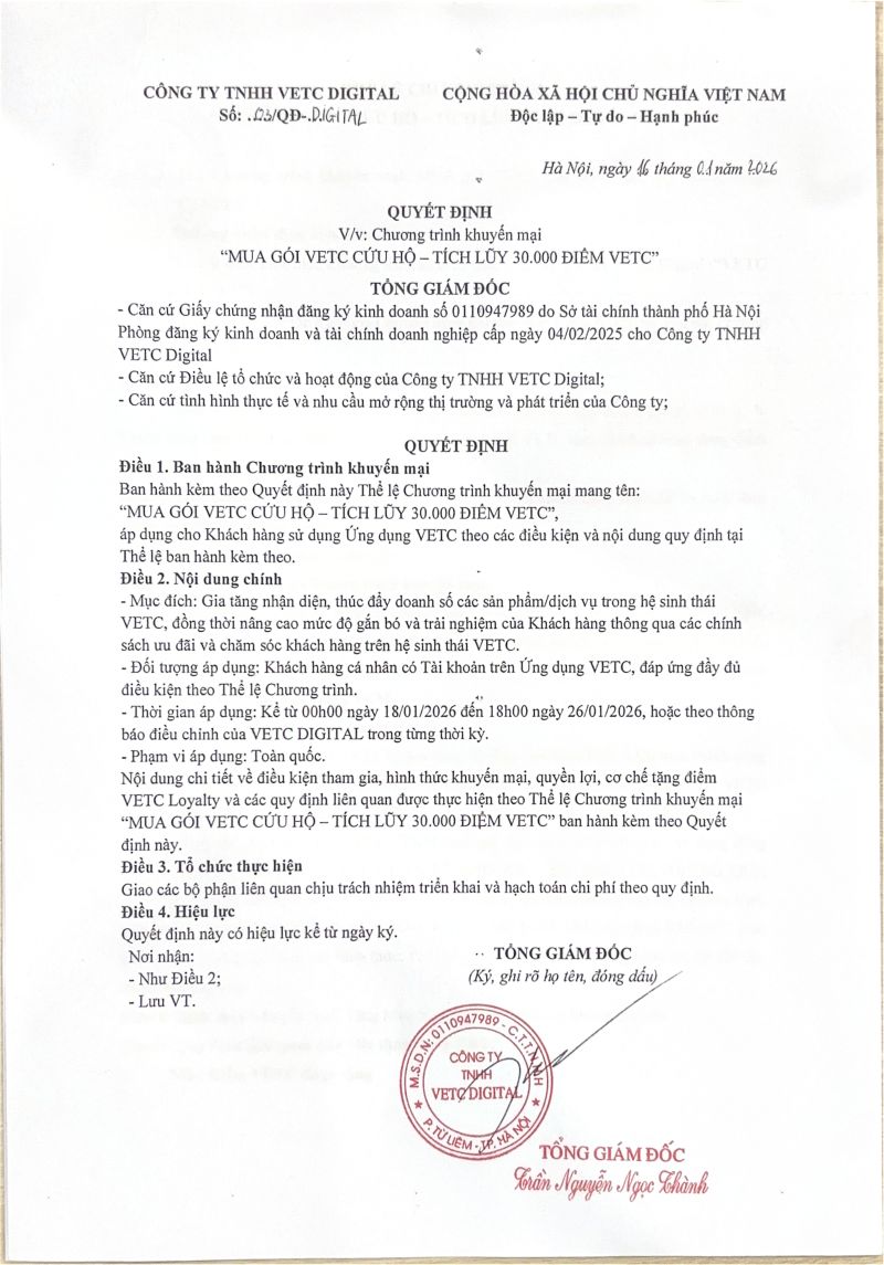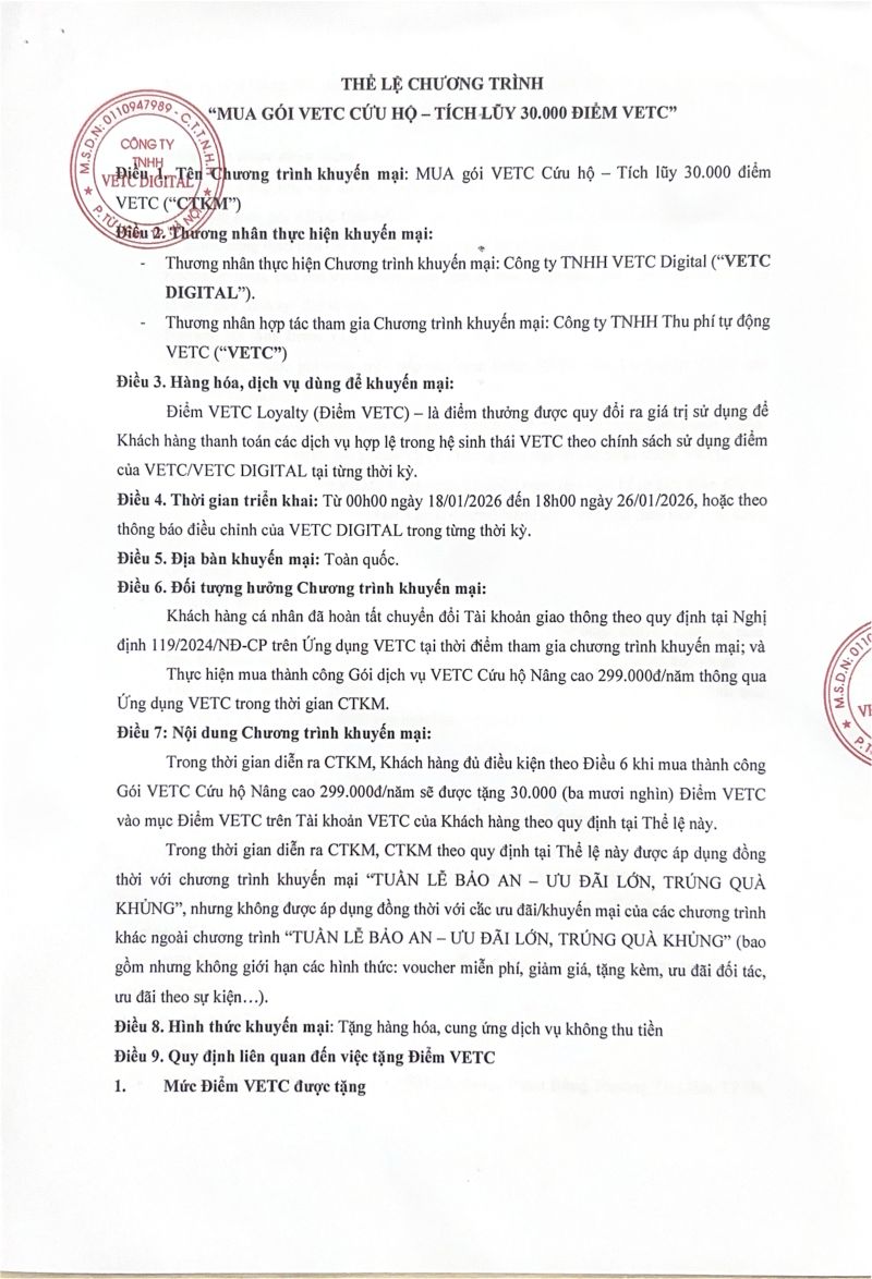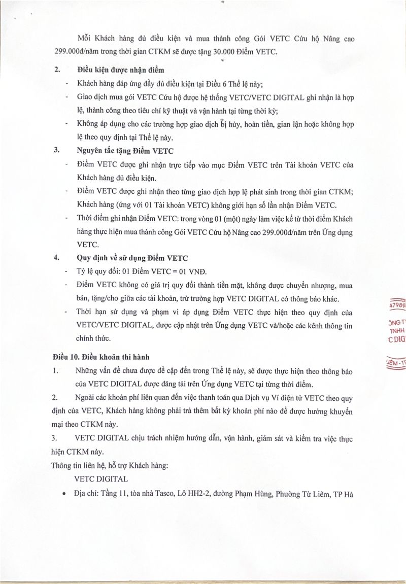 Đồng hành cùng hoạt động quay số may mắn, VETC gửi lời tri ân đến Quý khách hàng tham dự thông qua chương trình tặng điểm VETC Loyalty. Mỗi đơn hàng mua gói Cứu hộ VETC thanh toán thành công, khách hàng sẽ nhận được 30.000 điểm VETC.