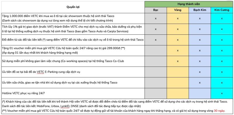 Thứ hạng Hội viên được xác định dựa trên tổng giá trị chi tiêu hợp lệ của khách hàng khi sử dụng các dịch vụ liên quan đến ô tô trong hệ sinh thái Tasco, bao gồm: