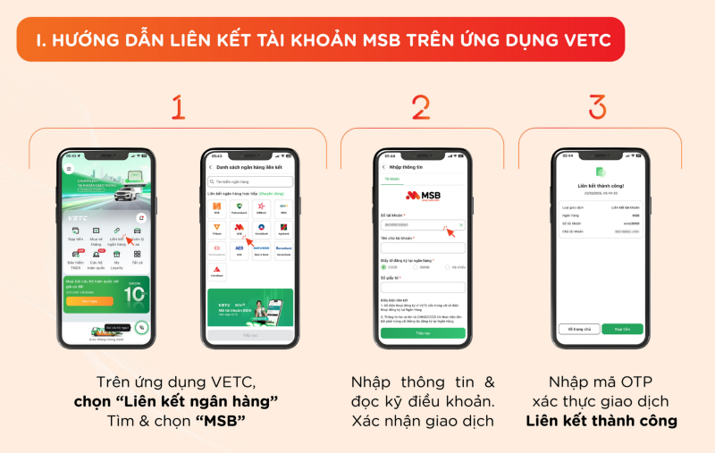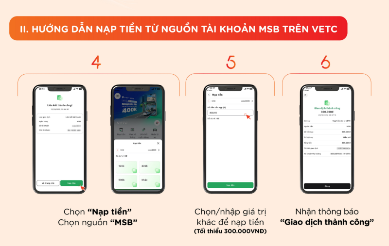 - Đối với khách hàng chưa có tài khoản MSB: Mở mới tài khoản MSB, sau đó liên kết tài khoản thanh toán MSB với ví VETC lần đầu và nạp tối thiểu 300.000 đồng từ nguồn tài khoản MSB.